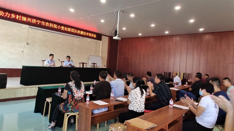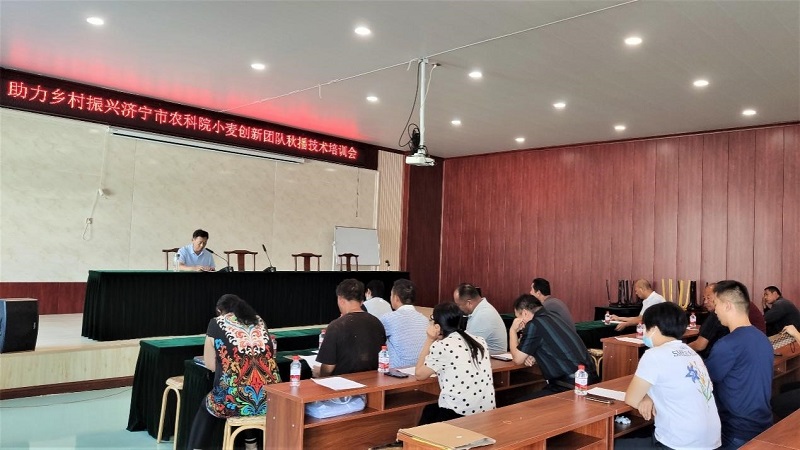 如何种足种好今年冬小麦,事关人民群众种植切身经济利益,事关国家粮食生产稳定问题。为指导农户切实做好小麦秋播工作,高标准、高质量种好小麦,确保明年小麦丰产丰收,9月16日,应梁山县农技推广站的邀请,济宁市小麦创新团队在国家级合作社梁山庄稼人粮食种植专业合作社举办了小麦秋播技术交流与培训会议。市小麦创新团队岗位专家、市农科院小麦所所长王霖、创新团队成员梁山县农技推广站站长卢家文、汶上县农技推广站长郭延习、梁山县馆驿镇农技推广站站长陈方喜,我院小麦所部分科研人员及当地种粮大户20余人参加了本次培训会。
