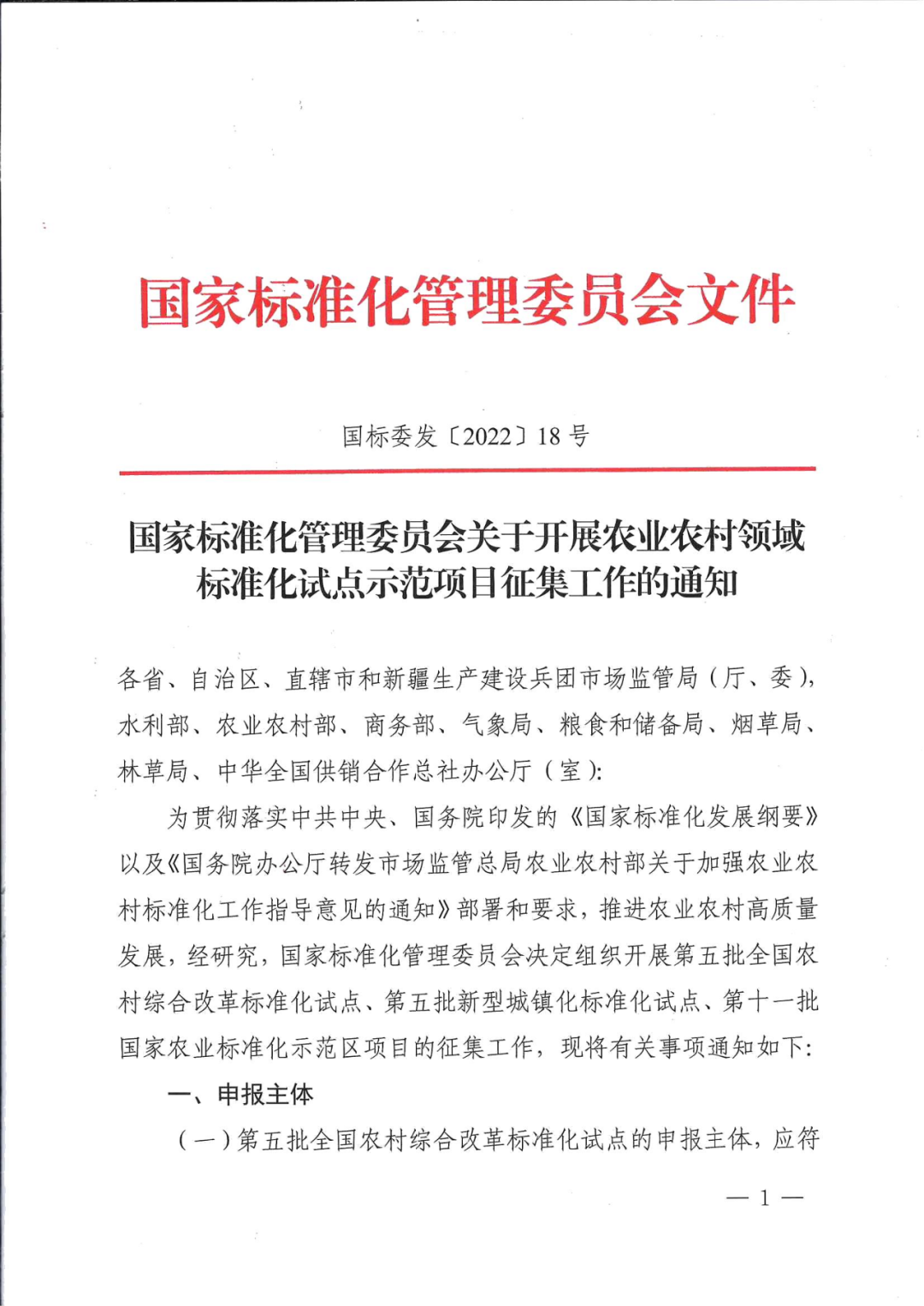 国家标准化管理委员会关于开展农业农村领域标准化试点示范项目征集工作的通知