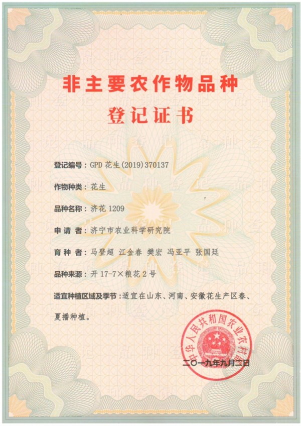农产品研究所七个新花生品种完成登记程序,分别是: 济花501 登记编号:GPD花生(2019)370132 济花601 登记编号:GPD花生(2019)370133 济花603 登记编号:GPD花生(2019)370134 济花605 登记编号:GPD花生(2019)370135 济花1206 登记编号:GPD花生(2019)370136 济花1209 登记编号:GPD花生(2019)370137 济花1211 登记编号:GPD花生(2019)370138 (农产品研究所 供稿)