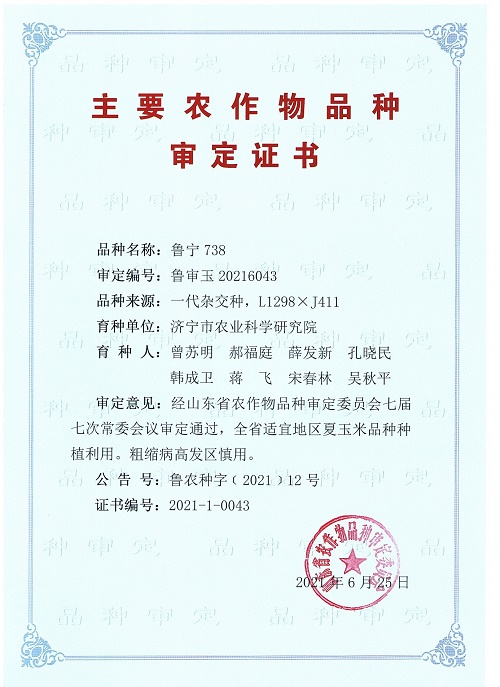 e77乐彩拟转让品种简介 高产稳产、宜机收、中穗型品种鲁宁738(鲁审玉20216043)